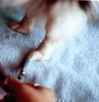 trimming and cleaning up the look of the hock on the rear leg. The hock